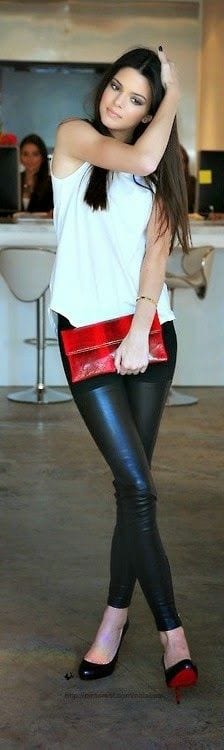Plain casual white vest top with leatherette jeggings. Finished with rounded pumps and red clutch.